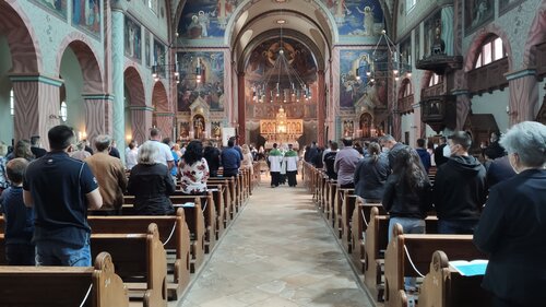 Bei einem Gottesdienst, den er zweisprachig zusammen mit dem Leiter der Mission Pater Ivan Cilic OFM und Pfarrer Mirko Cavar in der Kirche St. Sebastian zelebrierte, zeigte Bischof Bertram sich vor zahlreichen Gläubigen davon beeindruckt, dass vor allem viele junge Menschen gekommen waren.