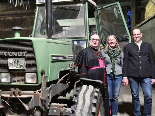 Wahrlich „Stallgeruch“ hatte der Festgottesdienst, den Bischof Dr. Bertram Meier am heutigen Samstagabend in der Maschinenhalle eines Bauernhofs in Großkemnat bei Kaufbeuren gefeiert hat. Anlass seines Besuchs war das 25-jährige Jubiläum der Bäuerlichen Familienberatung im Bistum Augsburg. Bereits vor der Messe nahm sich der Bischof bei einem Hofrundgang ausführlich Zeit für die Anliegen der Bauernfamilie und stattete den Tieren im Stall einen ganz persönlichen Besuch ab.
