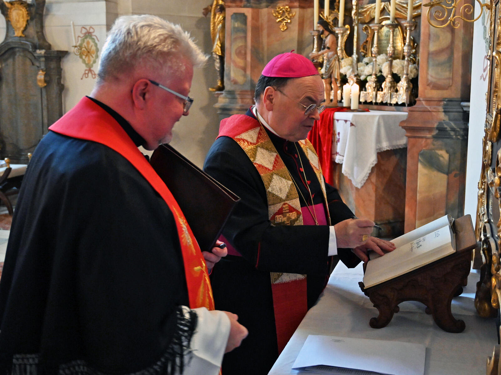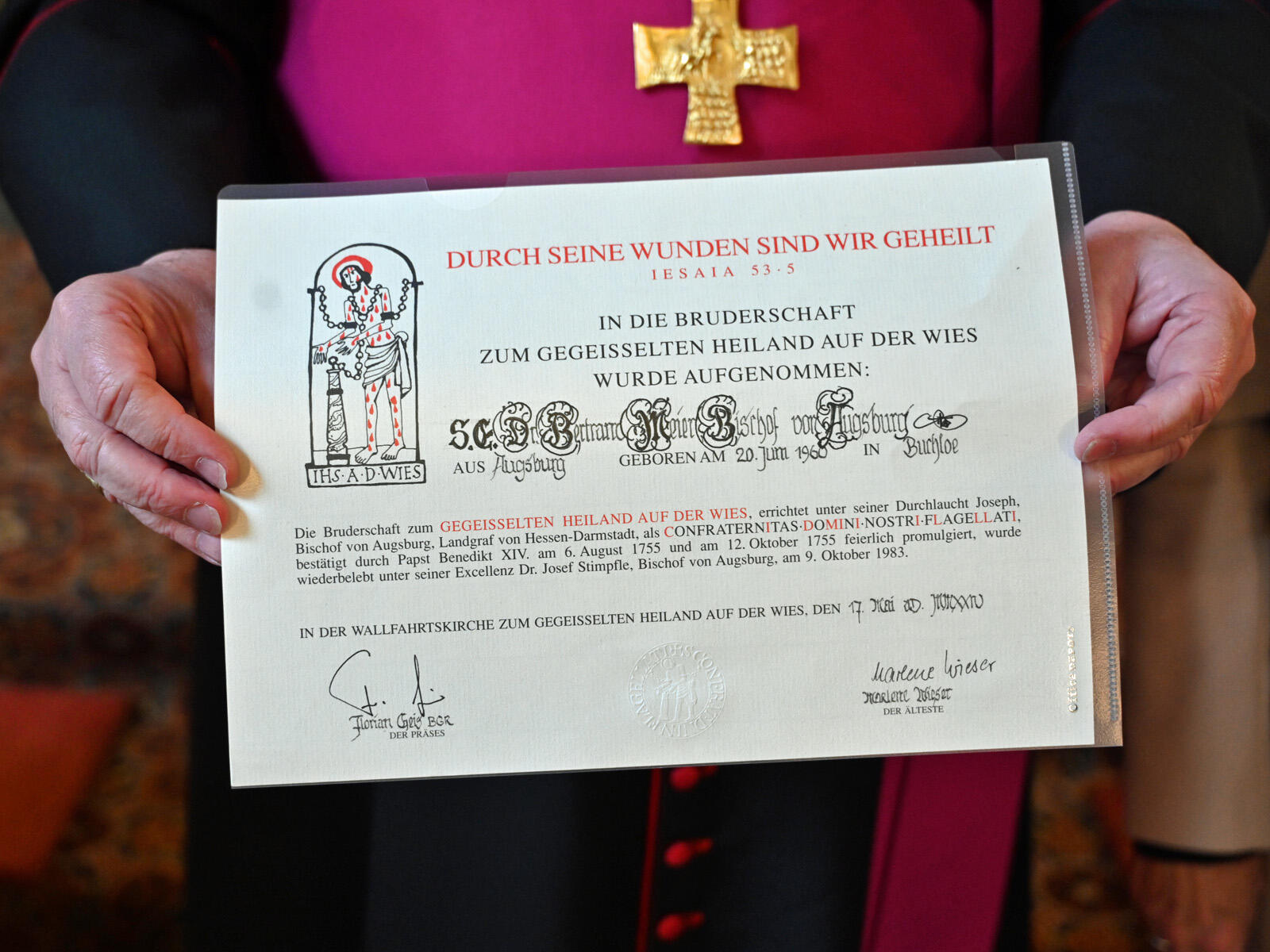 Im Rahmen einer feierlichen Vesper in der Marienkapelle des Augsburger Domes wurde Bischof Dr. Bertram Meier am Freitagabend in die „Bruderschaft zum Gegeißelten Heiland auf der Wies“ aufgenommen. Als Zeichen seiner Mitgliedschaft trug er sich in das Bruderschaftsbuch ein.