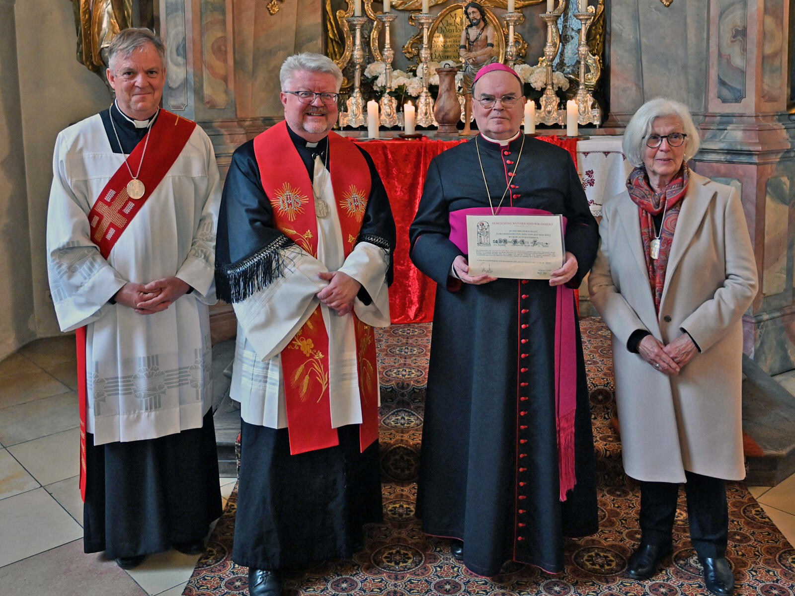 In seiner kurzen Ansprache ging der Bischof darauf ein, dass die Passion Jesu ein einziges Zeichen der Liebe sei. Jesus habe ganz menschlich eine furchtbare Passion erlitten. Aber auch heute würden viele Menschen ihrer „Passion“, also ihren Leidenschaft nachgehen und dabei manchen Rückschlag in Kauf nehmen. Jesus hingegen habe eine Passion für die Menschen gehabt und sei ihnen im Leid vollkommen gleich geworden. Gleichzeitig erinnerte er daran, dass auch die Bruderschaft von der Wieskirche eine Leidensgemeinschaft darstelle. Die Mitglieder hätten den Auftrag füreinander zu beten, und so auch ihn in seinem Dienst zu unterstützen.