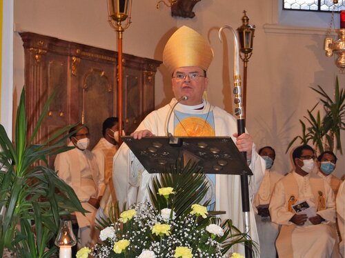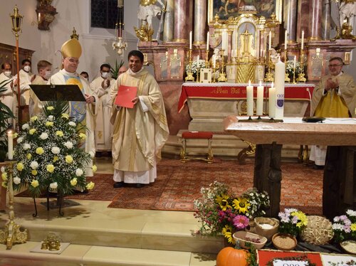 Ein eindrucksvolles Bild bot sich den Fischingern und Gästen am Sonntagabend, als zu den Klängen der Musikkapelle Fischen Bischof Bertram, Dekan Karl-Bert Matthias, Pater Joshy, Diakon Andreas Martin, die indischen Priester des Prämonstratenserordens und zahlreiche Ministranten in die Pfarrkirche einzogen. Der Festgottesdienst wurde musikalisch vom Kirchenchor unter der Leitung von Thoms Kroll (Orgel) gestaltet.
