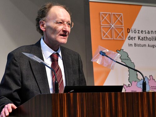 Bischof Dr. Bertram Meier hat vor dem Diözesanrat der Katholiken im Bistum Augsburg den weltweiten Synodalen Prozess als „Lebensform der Kirche“ bezeichnet und zu einer „Kultur des synodalen Dialogs“ aufgerufen. Am Abend des ersten Tages der Herbstvollversammlung des Laiengremiums diskutierten die Delegierten angeregt mit Bischof Bertram über die Situation der Kirche und Chancen für die Zukunft. Das zentrale Thema der Diözesanrats-Tagung wurde am zweiten Tag debattiert: Es ging um die "Familie als Keimzelle von Kirche und Gesellschaft". Hierzu gab es am Samstag zwei Vorträge.
