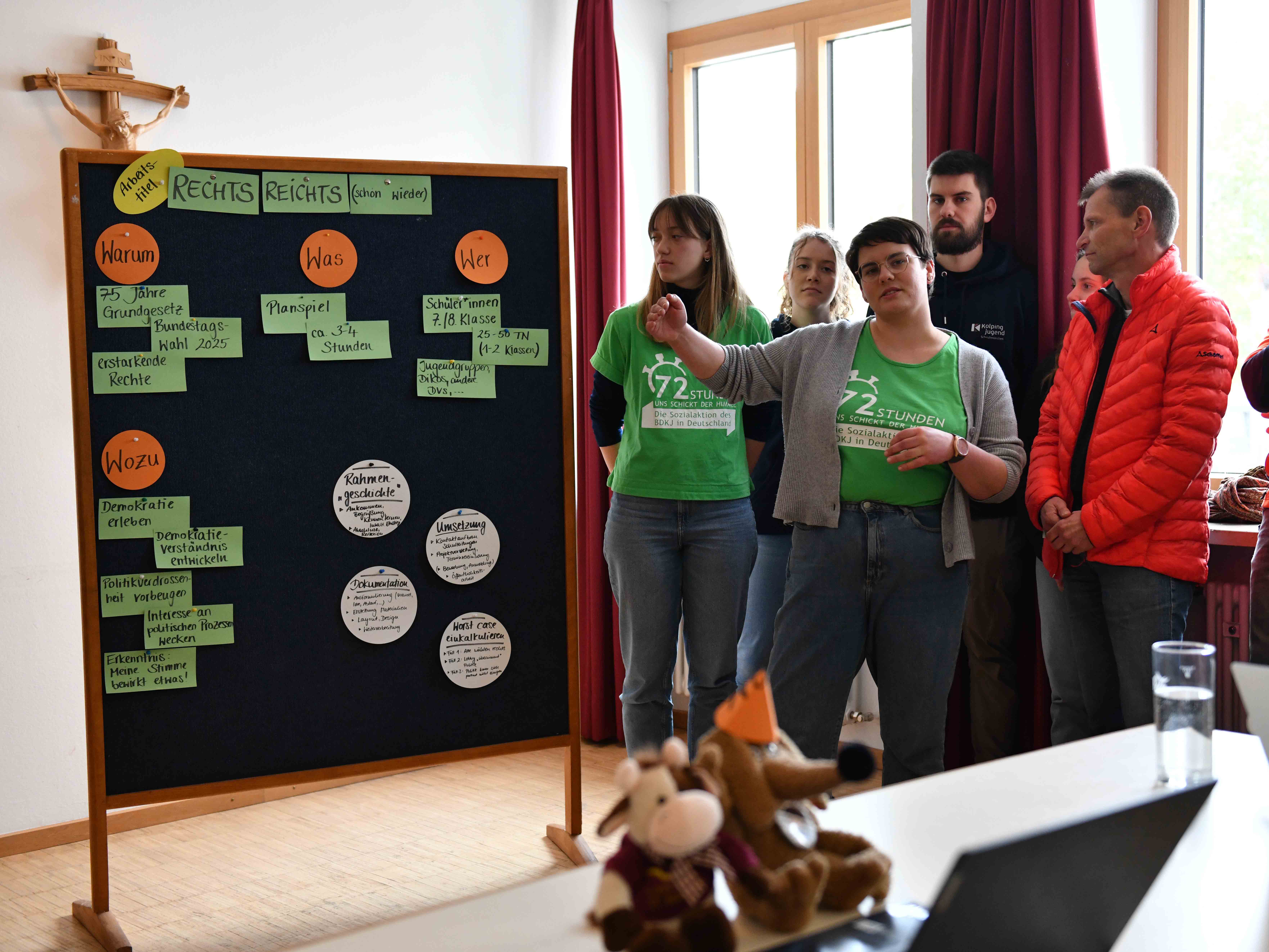 Einen eher inhaltlichen Schwerpunkt setzte hingegen die Kolpingjugend Schwabmünchen mit ihrem Projekt. Rund um die Themen „Demokratie“, „75 Jahre Grundgesetz“ und „gegen Rechtsextremismus“ entwickelten die Jugendlichen ein Planspiel, das im Anschluss an die Aktion in Schulen, aber auch verbandsintern, zum Einsatz kommen kann. „Wir wollten eher inhaltlich arbeiten, um zu zeigen für welche Werte die Kolpingjugend steht. Ziel unseres Planspiels ist es, Demokratie erlebbar zu machen. Die Kinder sollen spielerisch an das Thema herangeführt werden“, erklärte Katharina Heckl von der Schwabmünchner Kolpingjugend in einer kurzen Vorstellungsrunde.