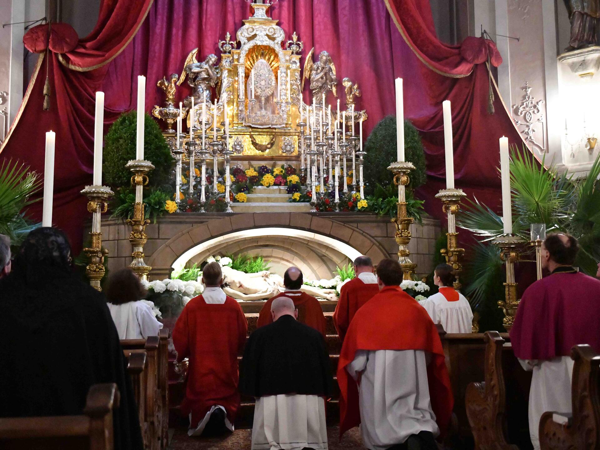 Im Anschluss an die Karfreitagsliturgie zog der Bischof mit der Monstranz zum Heiligen Grab in der Marienkapelle. Dort betete er gemeinsam mit den Weihbischöfen, dem Domkapitel, Priestern und Diakonen sowie den Rittern vom Heiligen Grab zu Jerusalem vor dem ausgesetzten Allerheiligsten. Auch am Karsamstag ist es im Anschluss an die Laudes bis 17 Uhr zur Anbetung ausgesetzt.