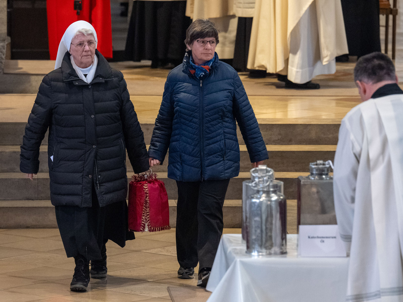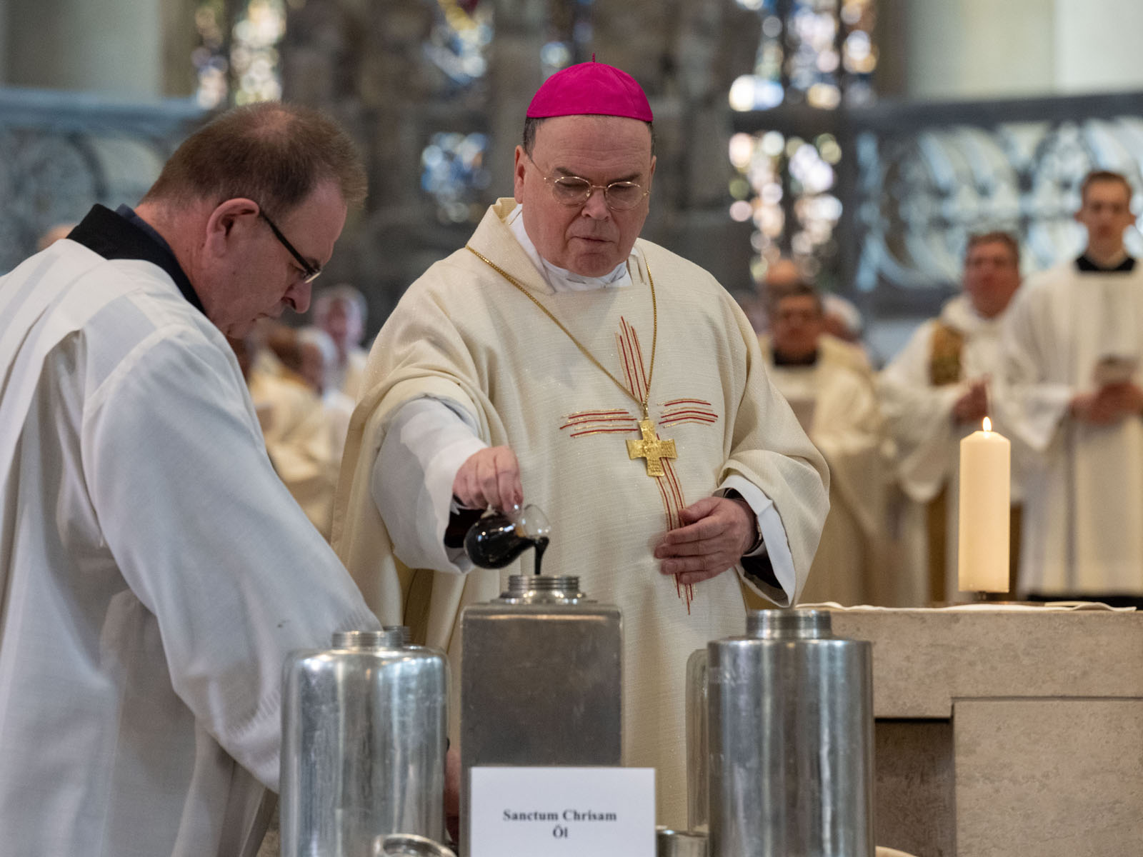 Zwei Vertreter der Ritterschaft, zwei Klinikseelsorgerinnen sowie zwei Diakone trugen die zu weihenden Öle durch den Mittelgang des Domes nach vorne zum Bischof. Anschließend sprach er die zugehörigen Segensgebete. Im Anschluss an den Gottesdienst nahmen Vertreterinnen und Vertreter der 23 Dekanate die neugeweihten Öle mit in ihre Heimat. Der Karl-Kraft-Chor der Augsburger Domsingknaben führte unter der Leitung von Domkantor Dr. Julian Müller-Henneberg die „Missa in G“ von Colin Mawby (1936-2019) auf.