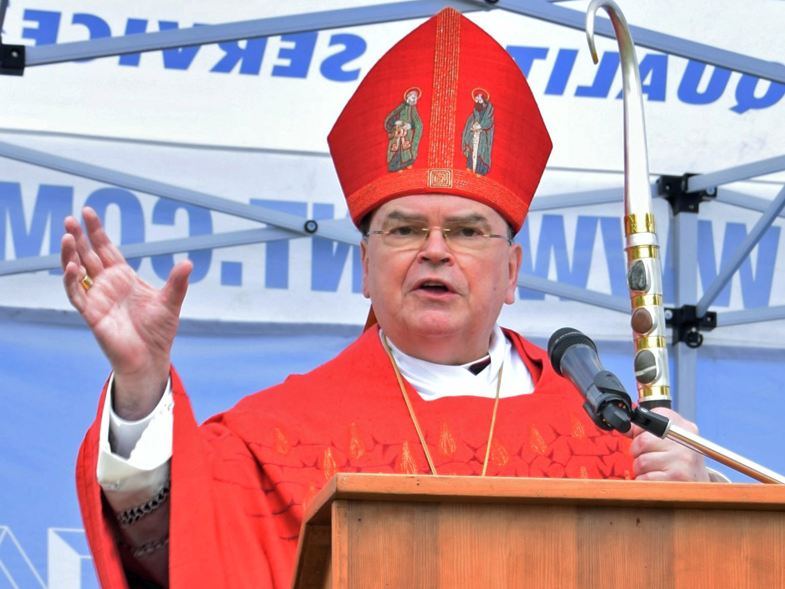 Die stimmungsvolle musikalische Gestaltung übernahmen die Weisenbläser sowie die Sängerin Margarete Stick. Durch ein Spalier der Kindergartenkinder mit dem Team des Kinderhauses St. Theresia gelangte der Bischof auf die kleine Bühne, auf der er den Gottesdienst feierte.