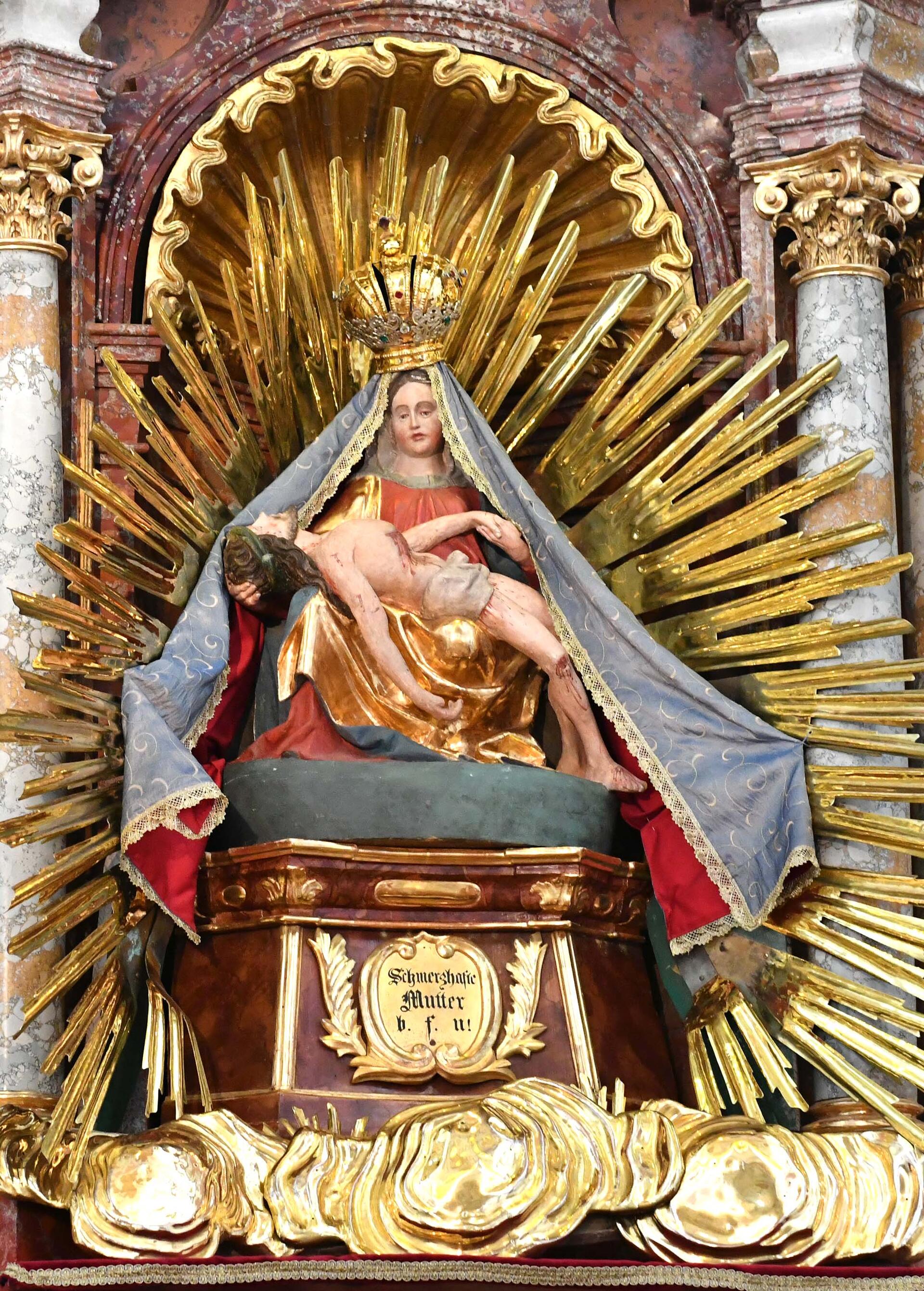 Überliefert ist, dass während des 30-jährigen Krieges schwedische Soldaten in Vilgertshofen das Holzbildnis der Schmerzensmutter ins Feuer geworfen hatten, welches aber nicht brennen wollte und so gerettet werden konnte. Seitdem ist die Marienverehrung in Vilgertshofen ständig angewachsen. Schon 1708 feierte die „Marianische Bruderschaft zur Schmerzhaften Muttergottes von Vilgertshofen“ erstmals ihr Titularfest. Seit 1730 findet dabei auch ein Umzug durch die Fluren mit Darstellungen aus der Leidensgeschichte Jesu statt - die „Stumme Prozession".