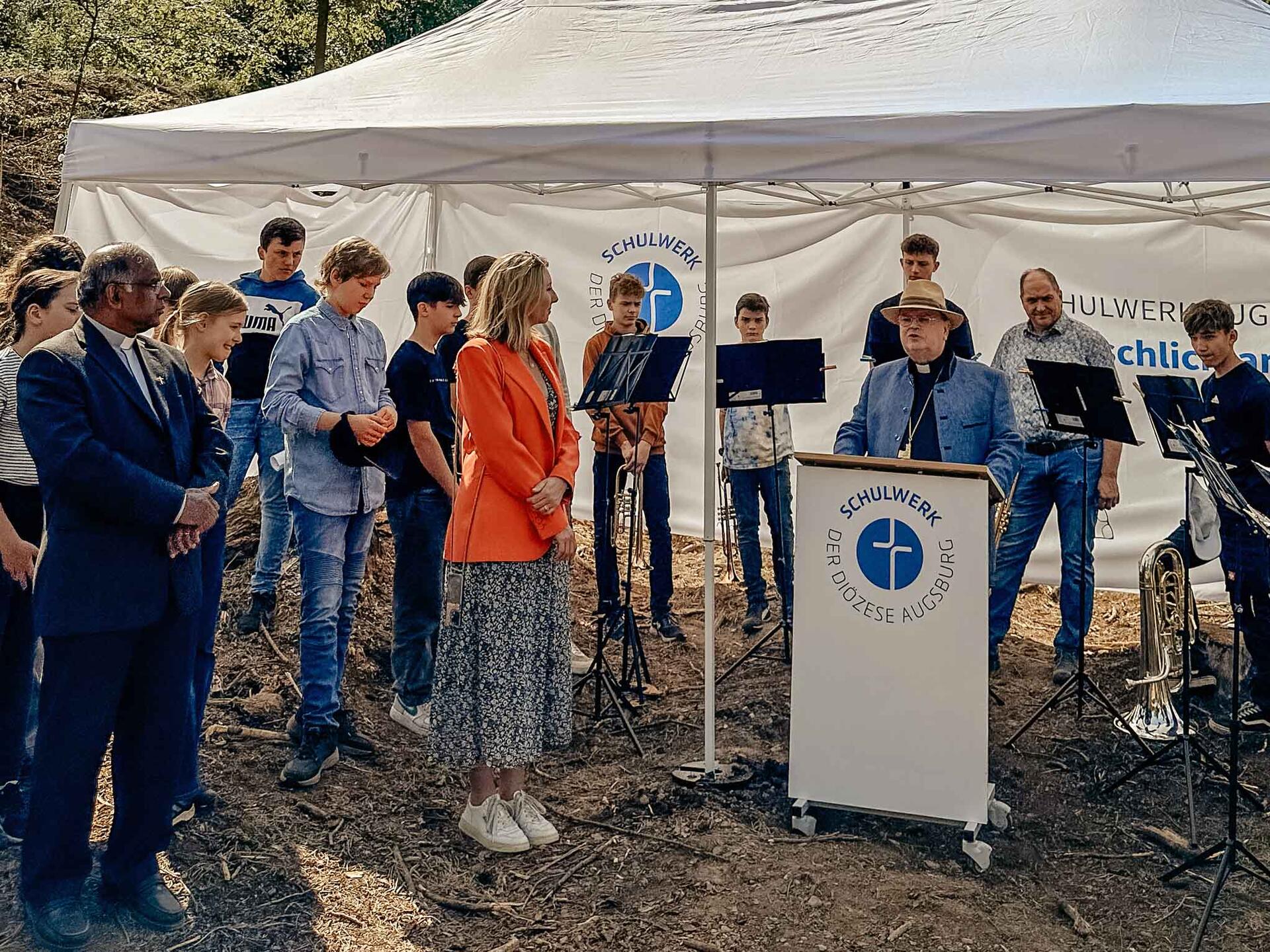 Diesen herausragenden Erfolg feierten an diesem Tag nun Schülerinnen und Schüler des St.-Thomas-Gymnasiums Wettenhausen gemeinsam mit Bischof Dr. Bertram Meier, Kultusministerin Anna Stolz und Schulwerksdirektor Peter Kosak an der sogenannten "Pfarrschanze", einem 6,5 Hektar großen Waldgebiet des Bistums Augsburg bei Todtenweis. In diesem Waldgebiet musste eine große Fläche mit vielen Fichten abgeholzt werden, da diese vom Borkenkäfer stark geschädigt waren.