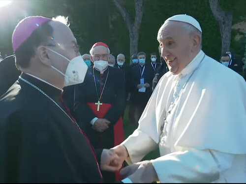 Am Ende der Feier krönte der Papst das Gnadenbild mit einer eigens geschaffenen Krone, die Bischof Bertram mit nach Augsburg nehmen wird. Hier, beim Originalbild der Knotenlöserin in St. Peter am Perlach, soll sie ihre Heimat finden. Die wertvolle Originalkopie, vor der Papst Franziskus in Rom betete, bekam der Heilige Vater vom Bischof geschenkt. Wegen technischer Probleme bei der Anreise hatte Bischof Bertram die Prozession zum Auftakt der Zeremonie noch nicht anführen können.