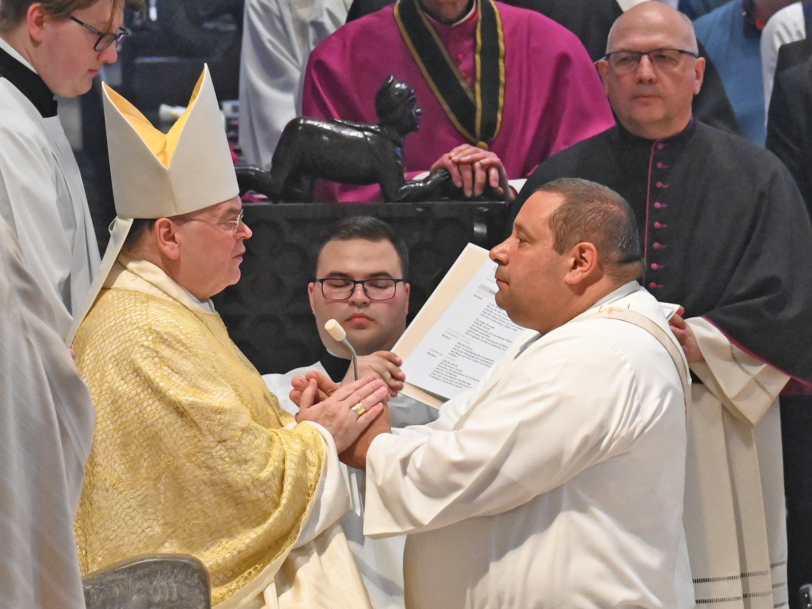 Vor diesem Hintergrund sei auch das Gehorsamsversprechen zu betrachten. Beim Stichwort „Gehorsam“ würden viele Menschen eher an „Abhängigkeit, Fremdbestimmung und Manipulation“ denken. Bischof Bertram: „Sie, liebe Weihekandidaten, werden Ihre Hände falten und in meine Hände legen. Ihr Versprechen wird handgreiflich – im wahrsten Sinne des Wortes. Mit der Übergabe der Hände wollen Sie sagen: ,Ich lege meine Zukunft in deine Hände. Ich vertraue mich dir an.‘“