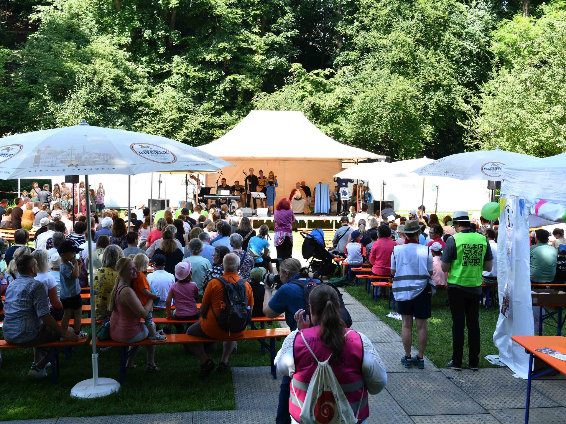 Augsburg (pba). Einen bunten und lebendigen Tag der Gemeinschaft und des Glaubens haben an diesem Samstag über tausend Kinder und Erwachsene beim „Ulrichsfest“ in den Grünanlagen am Roten Tor in Augsburg erlebt. Zum Abschluss des Ulrichsjubiläumsjahrs im Bistum Augsburg wurde mit vielfältigen Mitmachstationen und buntem Begleitprogramm noch einmal an die Bedeutung des Bistums- und Stadtpatrons als „Brückenbauer“ erinnert. Ein Wortgottesdienst mit Bischof Bertram eröffnete den Tag.
