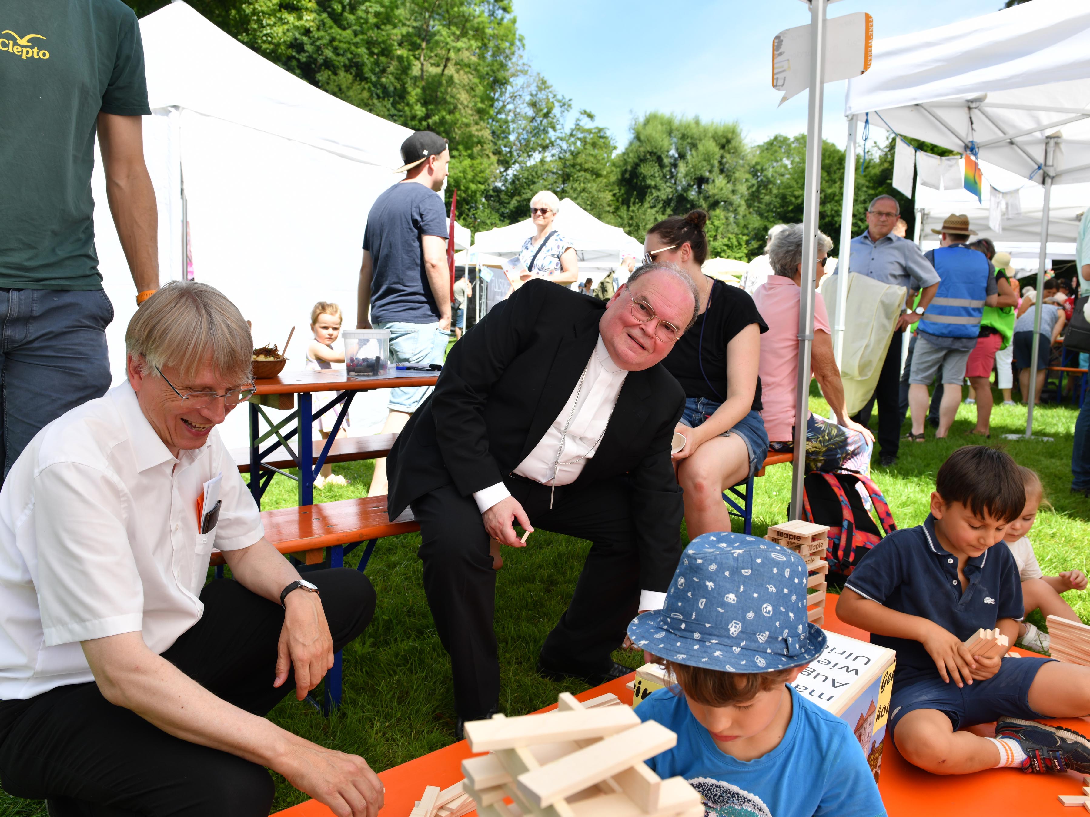 Einem kleinen „Festival“ glich die Atmosphäre, die sich nach dem Wortgottesdienst und dem Bühnenprogramm auf dem Gelände ausbreitete. Verteilt über die gesamte Grünanlage luden rund 25 Workshops zum Mitmachen ein: da war mal Kreativität oder Bewegung gefordert, mal stand geschickliches Talent oder einfaches Zuhören ganz im Vordergrund. Wer eine Stärkung brauchte, wurde bei einem der fünf „Foodtrucks“ gut versorgt. Auch Bischof Bertram versuchte sich an der ein oder anderen Station und stellte seine Kreativität unter Beweis.
