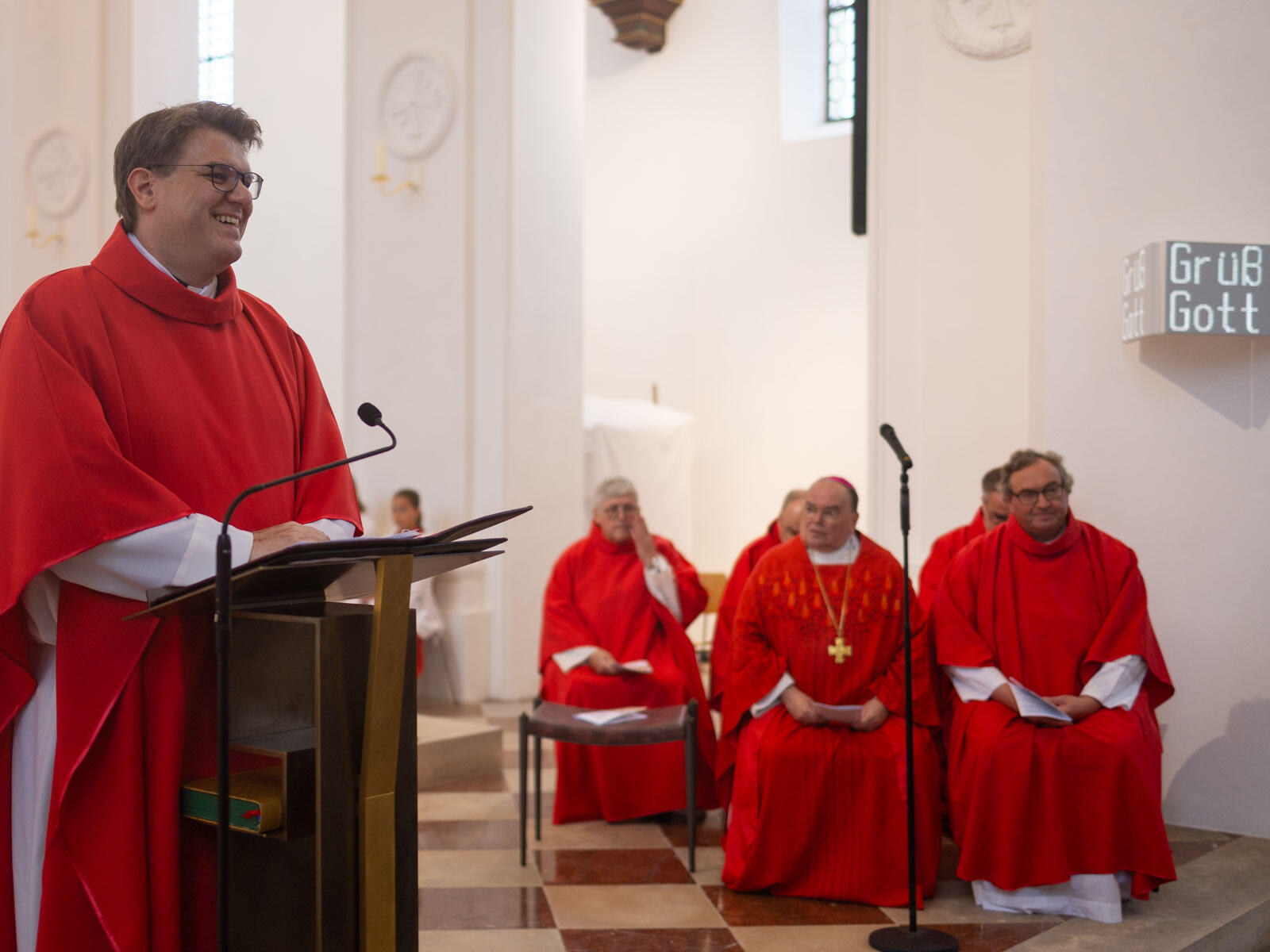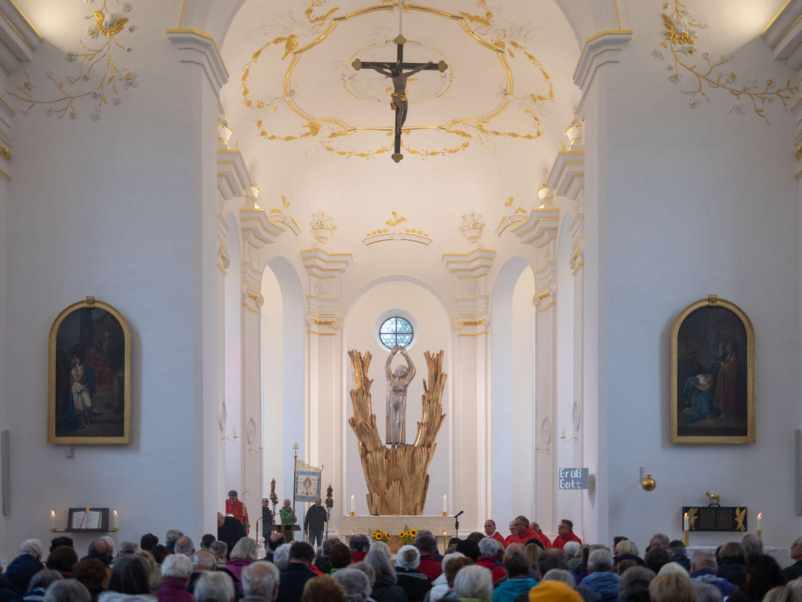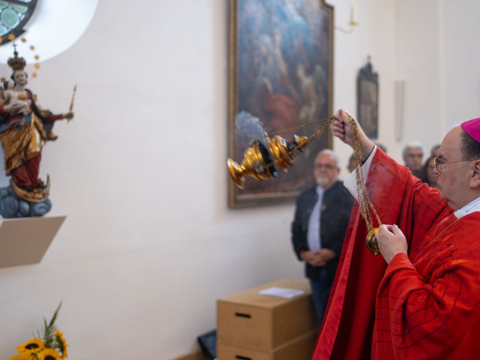 Die Narben der Vergangenheit erstreckten sich dabei nicht nur im Geist der Menschen bis in die Gegenwart hinein, sondern würden auch in der neusanierten Afrakirche sichtbar: Im frühen 18. Jahrhundert prachtvoll barock neuerrichtet, wurde die Wallfahrtskirche nach der Säkularisierung 1812 zum Munitionslager umfunktioniert. Erst Jahrzehnte später konnte es für die Kirche zurückgekauft werden: „Möge die nun neu erstrahlende Wallfahrtskirche, die in den letzten Jahrzehnten zu einer beliebten Kirche für Trauungen und Taufen geworden ist, vielen Menschen, die hier Rast machen oder einen familiären Höhepunkt feiern, die Frohe Botschaft künden, für die die heilige Afra mit ihrem Leben einstand. Amen.“