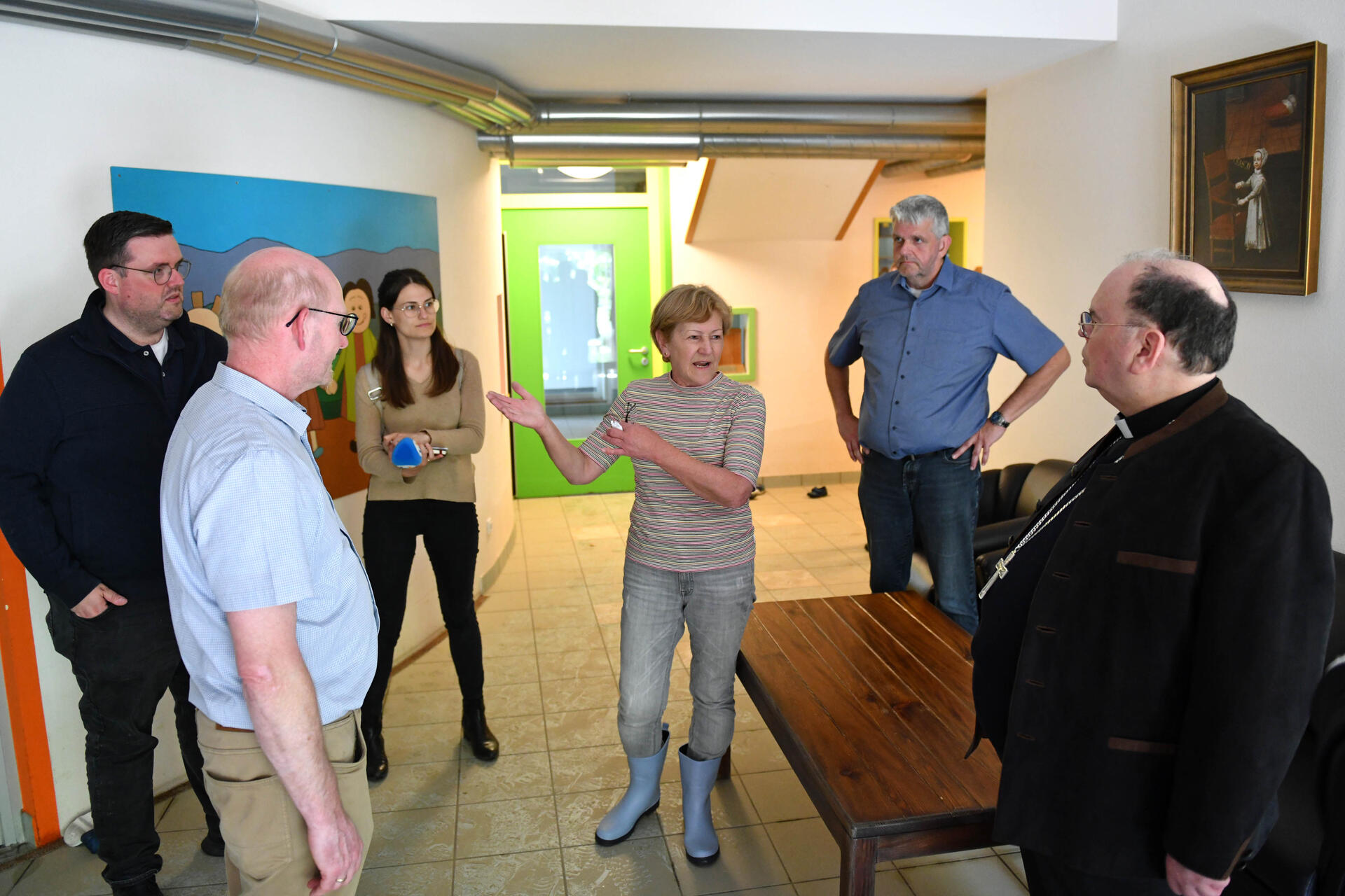 Begleitet wurde der Bischof von Dekan Werner Dippel, Jugendpfarrer Florian Stadlmayr, Verwaltungsleiter Hanke und Bürgermeister Harald Reisner. Gemeinsam besuchten sie neben den kirchlichen Gebäuden wie der Pfarrkirche St. Jakobus maj. und dem Pfarrhaus auch den wohl über Monate nicht mehr nutzbaren Kindergarten Maria Ward und eine fünfköpfige Familie, die von der über Nacht hereinbrechenden Flut besonders in Mitleidenschaft gezogen wurde.
